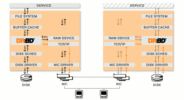 Het softwarepakket DRBD is ontworpen om als bouwsteen te fungeren voor High Availability (HA) clusters. Dit wordt gedaan door het spiegelen van elk blok op de hardeschijf. Zodoende wordt er een netwerk-gebaseerde RAID-1 formatie gecreëerd van de configureerde partitie/data over een reeks van servers. Alleen al in combinatie met Keepalived kan er zo een HA cluster worden gerealiseerd. Deze data kan daarna worden geserveerd door een daemon zoals Apache of bijvoorbeeld MySQL.